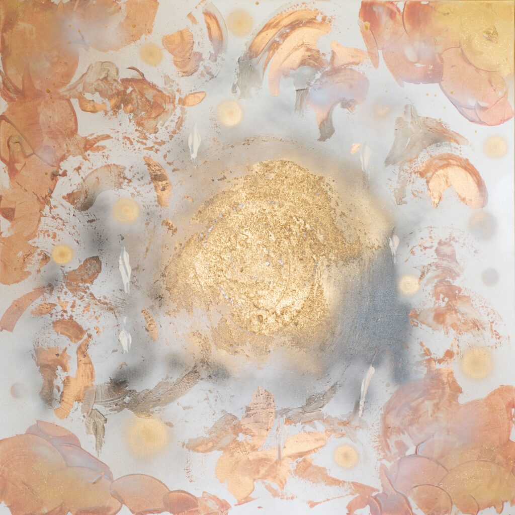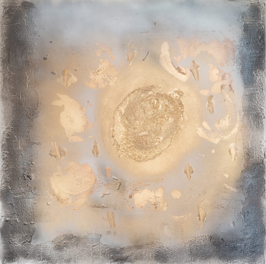 Fascinated by the mysterious beauty of the Universe for as long as she can remember; the moon, the stars and the sun became her refuge during difficult moments of her childhood. In these early years she perceived colour from the vibration of places and people as spots on her field of vision until the age of seven when her eyesight rapidly deteriorated plunging her into another vision, that of her inner world.